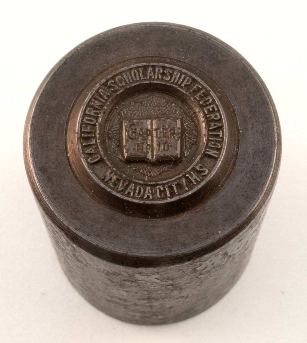 California Scholarship Federation Nevada City H.S. Steel Die- seal w image of book folded open with chapter 10 engraved at center-1 "x 1.25"City: Nevada CityCounty: NevadaState: CADate: