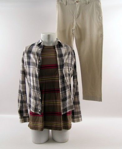 Jason Jackson (Bobb'e J. Thompson) screen worn, black, beige, and white plaid long sleeve button front 'Merona' shirt, (size S) olive with fuscia, black, yellow, and peach horizontal stripes short sleeve crew neck 'Stussy' t-shirt, (size S) and sand cotton twill flat front 'American Living' pants. (size 18)
