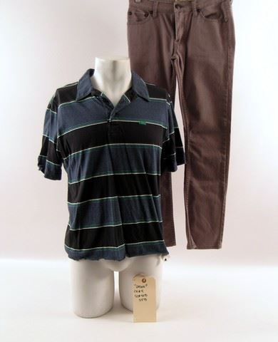 Jason Jackson (Bobb'e J. Thompson) screen worn, hero, black, green, purple, and white cotton 'Vans' polo shirt, (size L) and faded purple denim 'RSQ' jeans. (size 18) Includes wardrobe tag!