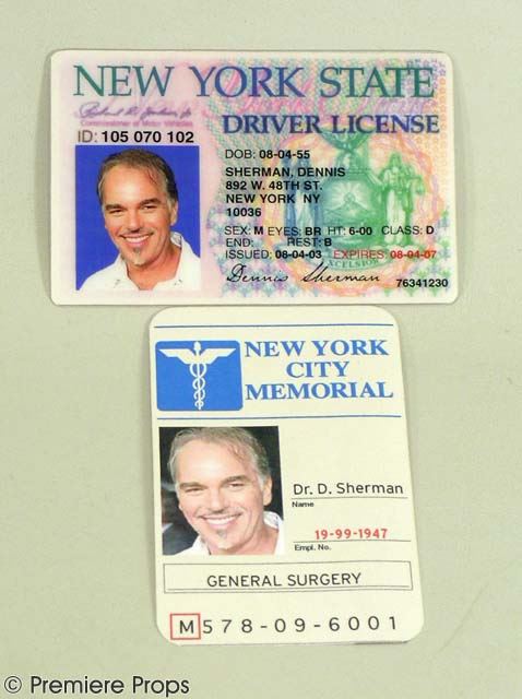 Set of Alias I.D. Card Props (both measure approximately 2 ¼'' x 3 ½'' / driver's license is laminated / both cards feature a photo of Dr.P and his alias, Dennis Sherman / made by studio just for movie) (DR. P)