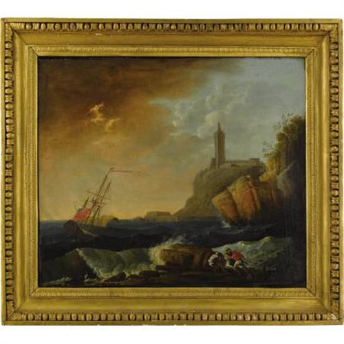 <B>School of CLAUDE-JOSEPH VERNET (French, 1714-1789)</B></I><BR><I>Shipwreck</B></I><BR>Oil on canvas<BR>25 x 29-1/2 inches (63.5 x 74.9 cm)<BR> <B>Condition Report:</B> Relined, scattered areas of inpainting throughout, with an approximately 6 inch long area of inpainting top center, craquelure throughtout sky.<BR><BR><b>Shipping:</b> Framed - without Glass, Small (<a target="_blank" href="http://www.heritageauctions.com/common/shipping.php">view shipping information</a>)