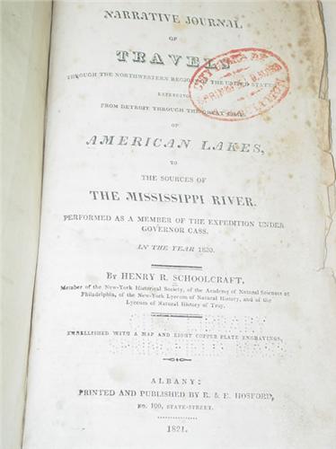 Schoolcraft, Henry R.. Narrative Journal of Travels Through the Northwestern Regions of the United States Extending From Detroit Through the Great Chain of American Lakes, to the Sources of the Mississippi River....In the Year 1820. Albany, NY: E.E. Hosford, 1821. First Edition. 8vo - over 7¾" - 9¾" tall. Hard Cover. Ex-Library. Fair Condition. 419pp [1] 4 Index, bound in leather with black leather spine label. Additional engraved title page (with tear) plus 4 (of 8) copper engraved plates, one of which is colored, lacks map. General cover wear, front hinge split, binding tight, interior foxing.