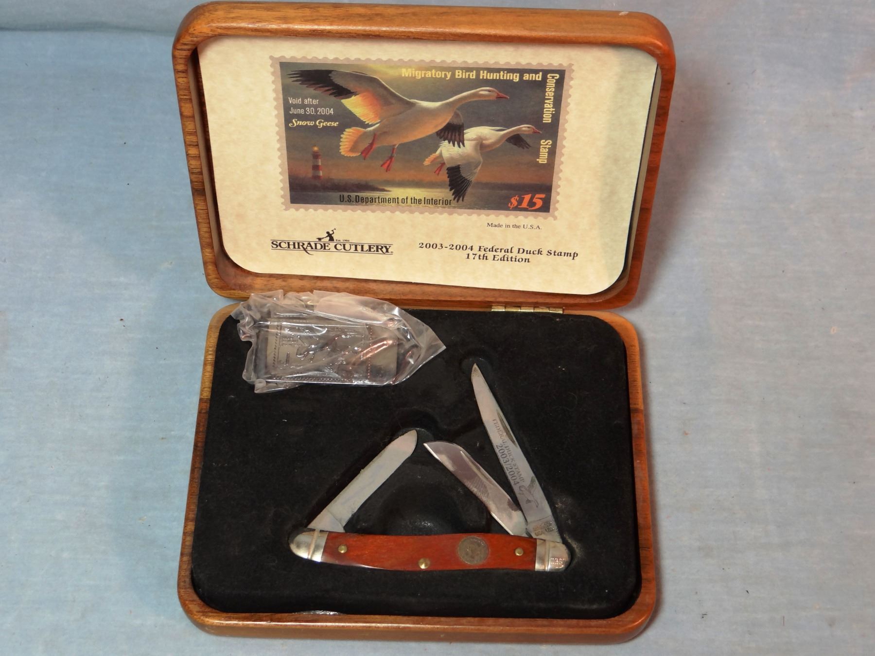 Schrade 2003 and 04 Fed. Duck Stamp pocket knife and money clip, in wood case and FFA Comm. Pocket k