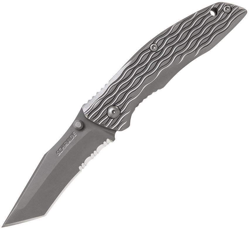 4.5" closed. 3.5" gray titanium coated D2 tool steel tanto blade. Gray sculpted 6Al-4V titanium handle. Thumb stud. Lanyard hole. Pocket clip