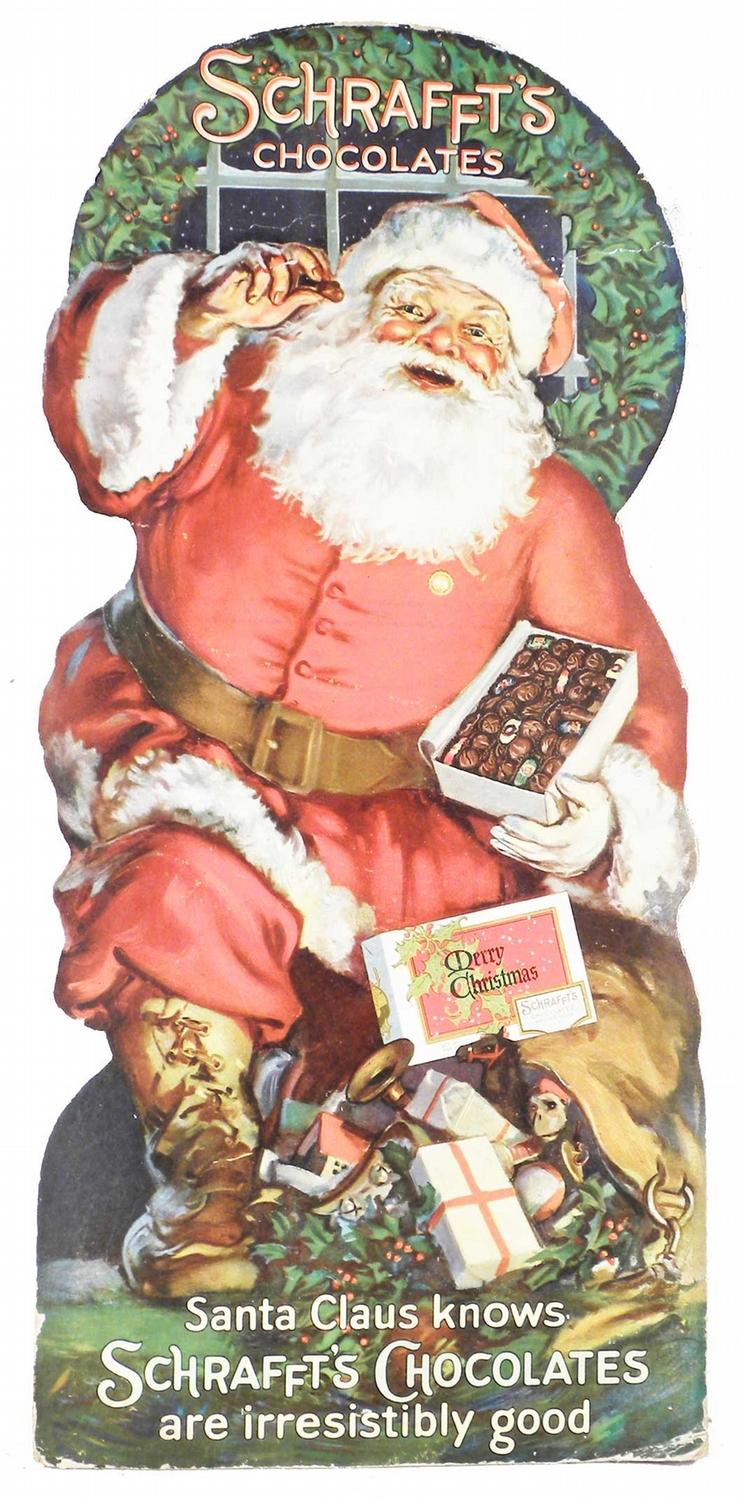 Schrafft's Chocolates Die Cut Cardboard Christmas Sign. Entitled, "Santa Claus knows Schrafft's Chocolates are irresistibly good". Small crease at 2:00 and dog eared bottom corners otherwise very good condition. 12 X 25 inches.