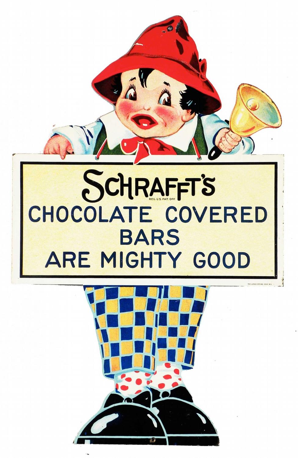 Schrafft's Die Cut Tin Sign. Entitled, "Chocolate Covered Bars are Mightily Good". Excellent condition. 11 1/2 X 17 3/4 inches.