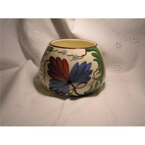 Beautiful colors in this piece of Schramberg. It is a perhaps a rose bowl. Came from an estate in Jackson, MS. Overall in good condition. Has a tiny flea bite on inside edge in one place and has some dirt on the inside which could be cleaned. The bottom has obvious wear. The close up picture of the edge of the bottom is not a chip. It looks like part of the original piece that has become soiled. Nice piece of German pottery.