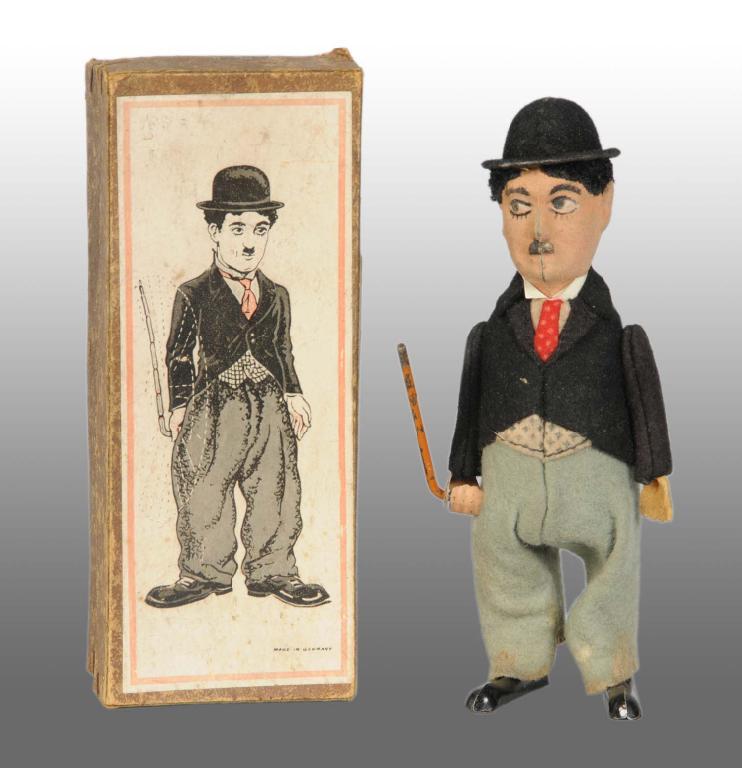In original box. German. 1920s. Schuco made two versions of this toy, one has a flocked face with a fuzzy texture and the other is a lithographed tin face. This is the flocked face variation. Cloth dressed, celluloid collar, metal cane and shoes. When wound, Charlie waddles forward and spins cane. Toy and clothing have some wear where cloth meets the metal feet. Comes with a laser copy of instruction sheet. Includes original box with beautiful label on front marked “Made in Germany” on bottom right hand corner. Minor staining to label. Collection of Carl Lobel. Condition (Excellent). Size 6 - 1/2" T.