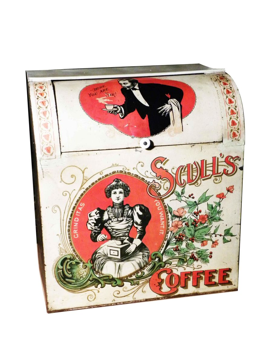 Schull's Coffee Tin Store Bin. Some minor touch up at left and right seams otherwise very good condition. 19 1/2 X 21 1/2 X 13 1/2 inches.