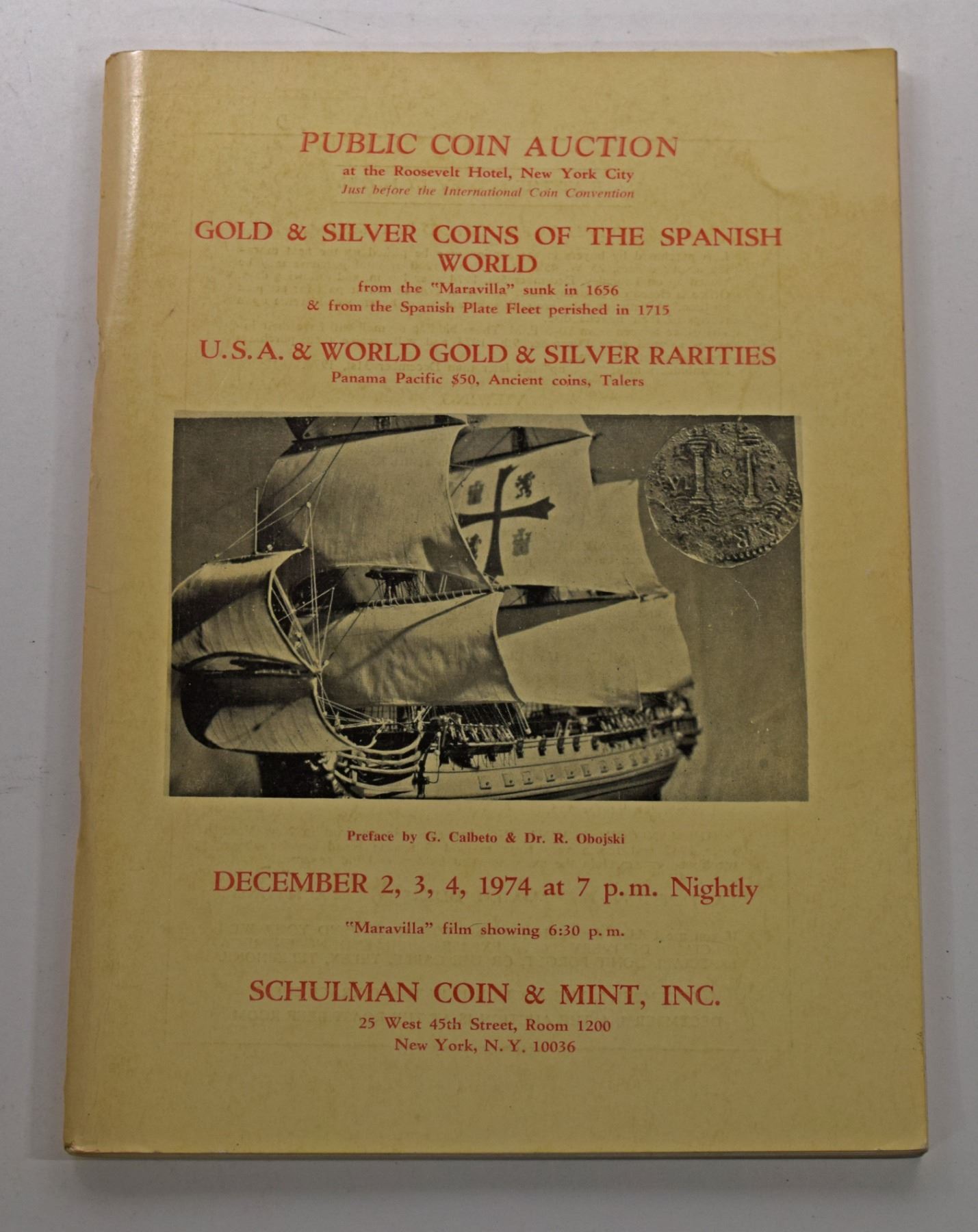 Schulman Coin & Mint, Inc. GOLD & SILVER COINS OF THE SPANISH WORLD FROM THE MARAVILLA SUNK IN 1656 & FROM THE SPANISH PLATE FLEET PERISHED IN 1715. December 2-4, 1974. 8vo; Softcover; Prominant Mexican numismatist and author, Clyde Hubbard's personal copy; This auction catalog includes 62 lots of gold and silver cobs and 9 silver bars from the Spanish galleon, “Maravillas” (sank 1656), and 221 lots of gold and silver cobs and 5 silver bars from the 1715 Fleet. Additionally, it has 7 lots of silver cobs from “A small salvage off the coast of Vero Beach on a sunny day”. Subject: History - Sunken Treasure