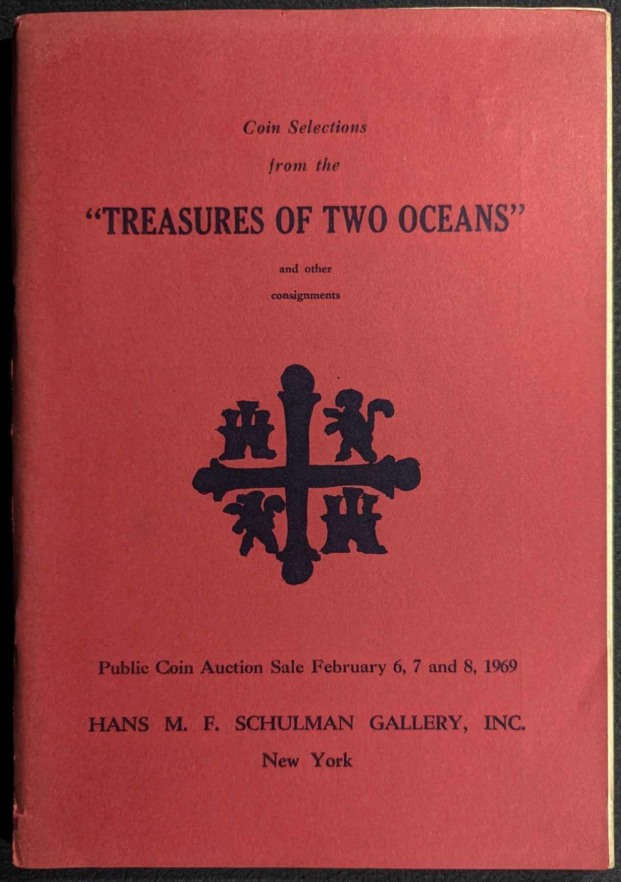 Schulman, Hans M.F. COIN SELECTIONS FROM THE 'TREASURES OF TWO OCEANS'. February 6-8, 1969. 1-1980 Lots. 8vo. This auction sale catalog includes numismatic material from Ancient Greece and Rome, Mexico, Latin America, Europe, Asia, and other foreign countries and includes coins from the Lucayan Beach treasure find and the wreck of the 'Vergulde Draeke'. The sale also includes Rare gold coins of the world, U.S. large cents, Important ancient Greek silver rarities, Roman silver and copper lots, crowns and minor coins of the world, odd and curious monies, Proclamation coins of the Americas, and Chinese rarities. New York. original red printed card covers. Fine. 120 pages. 46 b&w plates. PRL. Gengerke 61[546]. Lot weight: 0 lbs 9oz. Subject(s): Ancients, Latin American, European, World Coinage.