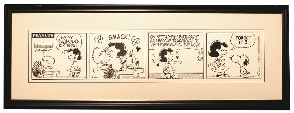 Original ''Peanuts'' comic strip, hand-drawn and signed by Charles Schulz. 16 December 1968 four-framed strip shows Lucy and Schroeder in one of their typical moments. Lucy vies for Schroeder's attention, finding an inconspicuous way to give him a kiss by using Beethoven's birthday as a ruse. Sadly, poor Snoopy doesn't get the same affection. Four-panel strip, measuring 33'' x 11'' is housed in a simple black frame with white mat. Fine condition. Excellent example of Schulz's work.