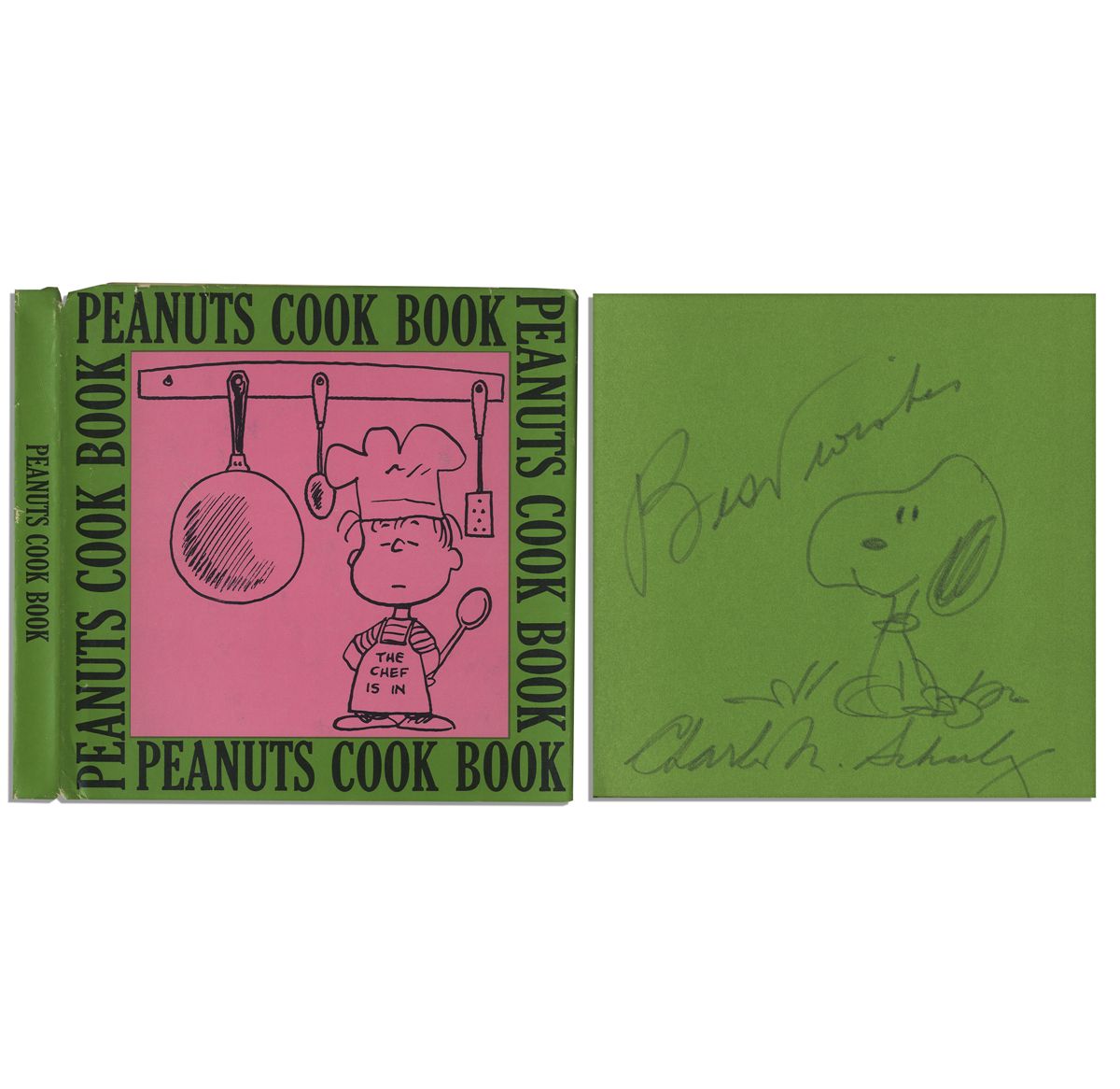 Charles Schulz hand-drawn sketch of Snoopy, drawn and signed within his book, ''Peanuts Cook Book''. Published by Determined Productions: San Francisco: 1969. Sketch of a happy Snoopy sitting in the grass appears on the front free endpaper, signed, ''Best wishes / Charles M. Schulz''. Book features an actual recipe and matching cartoon on every page, including a recipe for ''Peanuts Peanut Brittle'' and ''Great Pumpkin Cookies''. Unpaginated book is printed in black on bright pink and green leaves and bound in pictorial paper boards with original dustjacket. Measures 5.75'' square. Book shows very minor wear to corners, else near fine. Very minor shelf wear and edge wear to dustjacket, with some small tears to rear panel edges, else near fine.