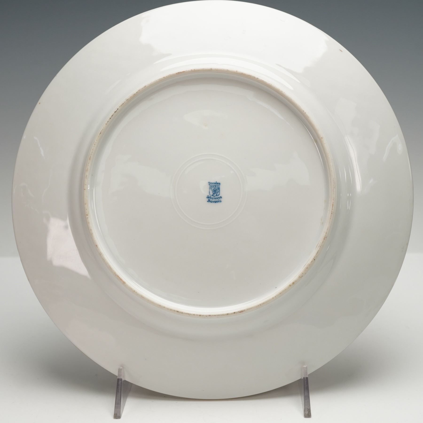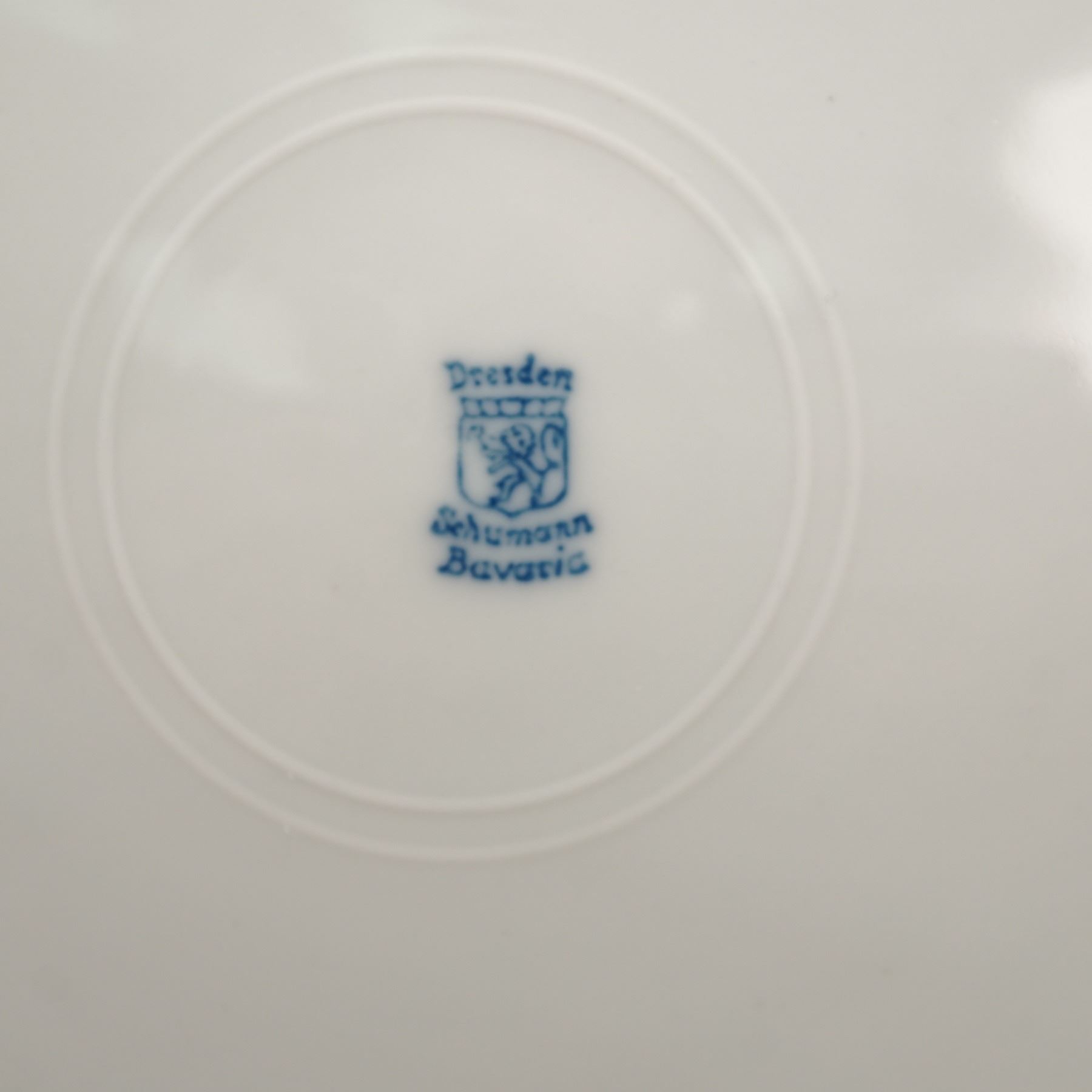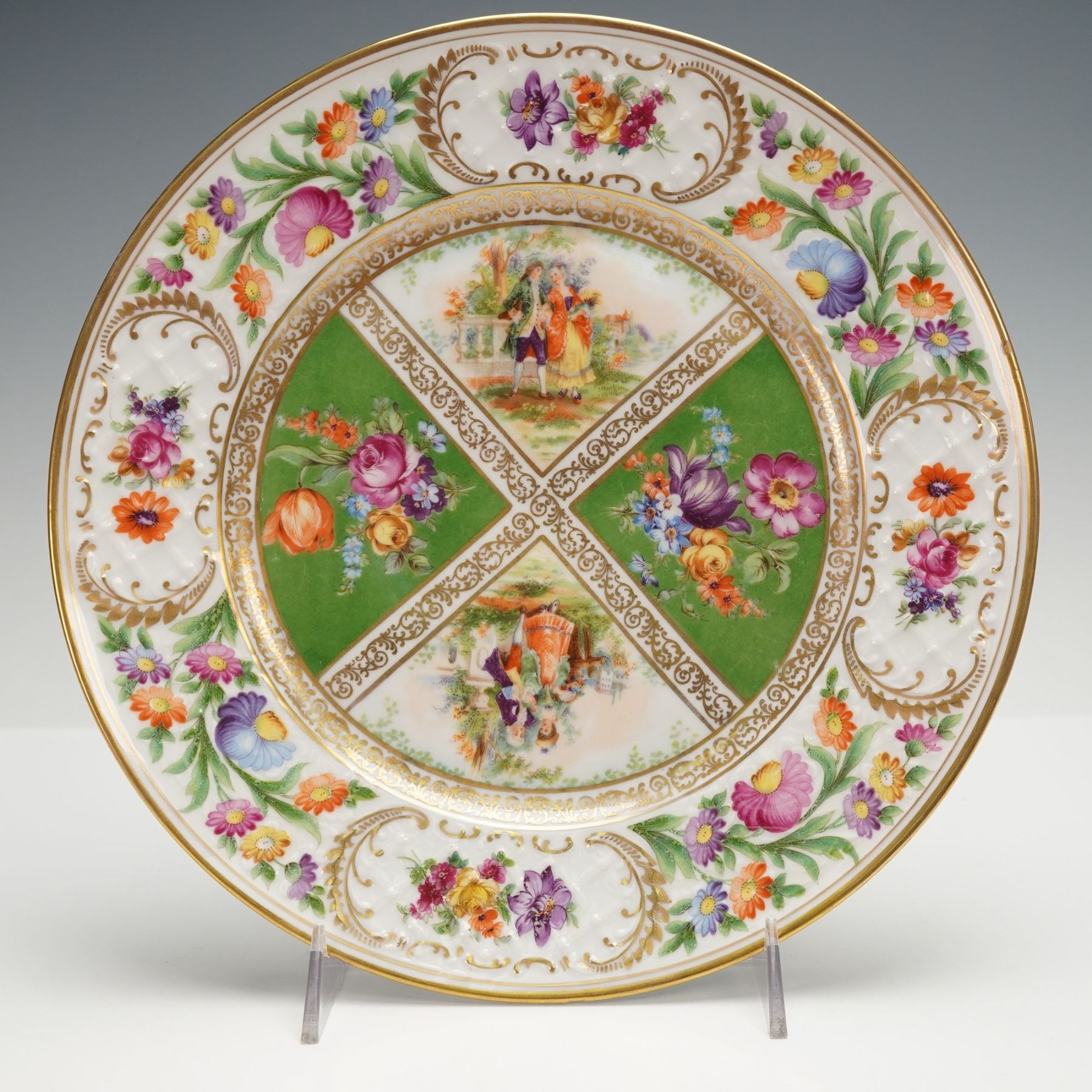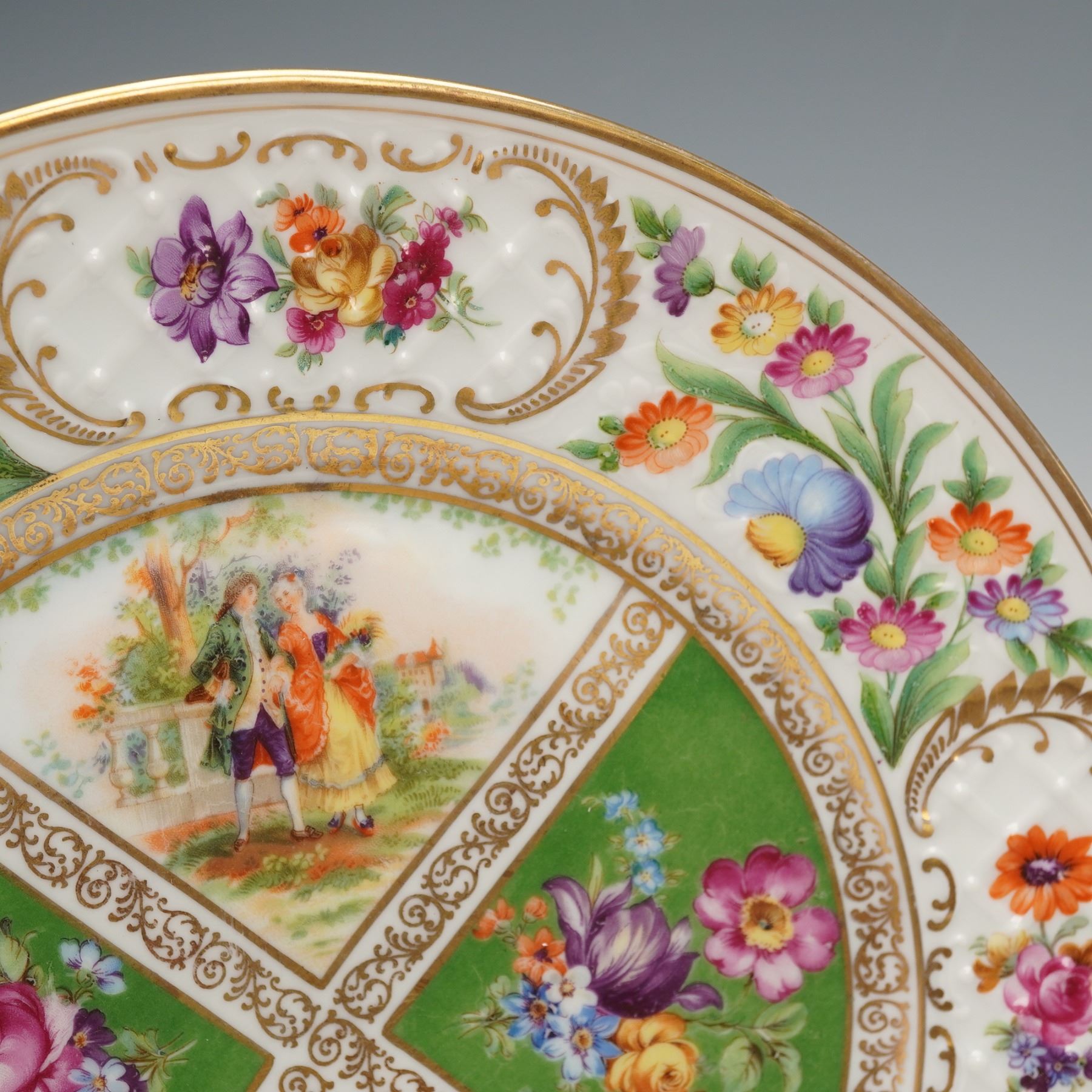 An ornate quatrefoil featuring Dresden decoration, richly embellished with vibrant floral sprays and romantic figural vignettes set within a paneled green and white ground. The design is further enhanced by intricate gilt scrollwork and textured rim. Dresden Schumann Bavaria backstamp.