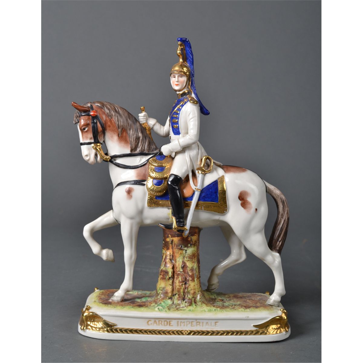 "Garde Imperiale," depicting a calvary soldier on horse, hand painted, and with name fired in gold on base. Marked for Schumann and Germany in blue on underside. 11.25" H x 8" L x 3.25" W. Circa late 19th century. Private collection St. Clair Shores, MI.