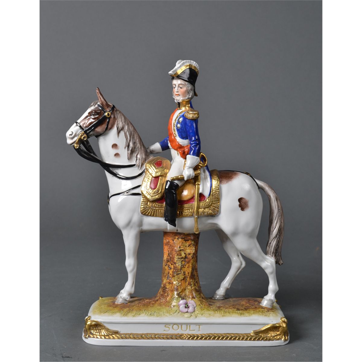 "Soult," depicting a calvary soldier on horse, hand painted and with name fired in gold on base. Marked for Schumann and Germany in blue on underside. 11" H x 8.25" L x 3.25" W. Circa late 19th century. Lacking left foot. Private collection St. Clair Shores, MI.