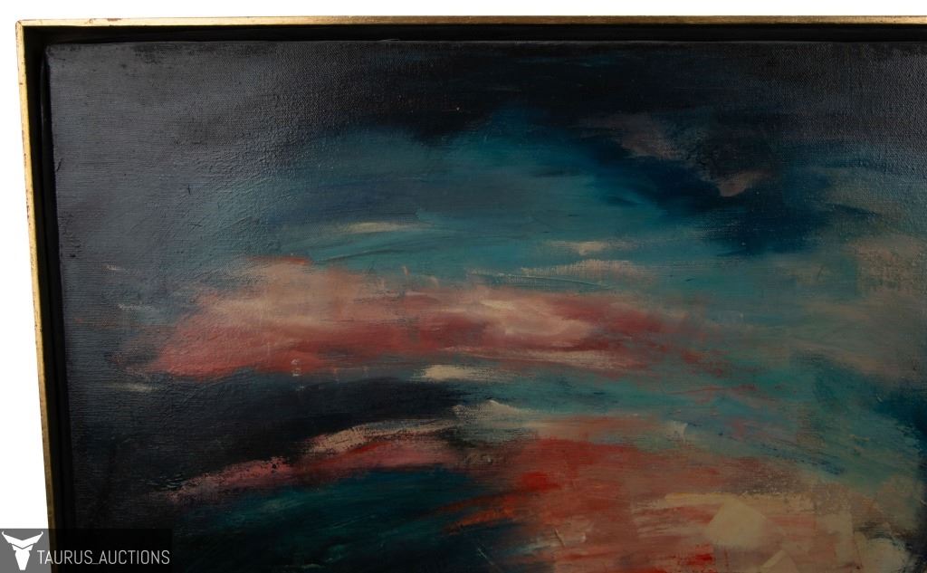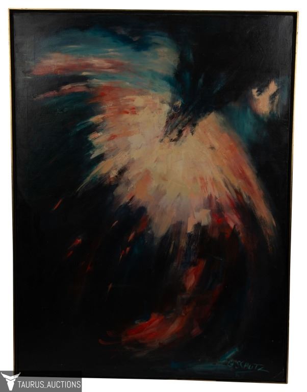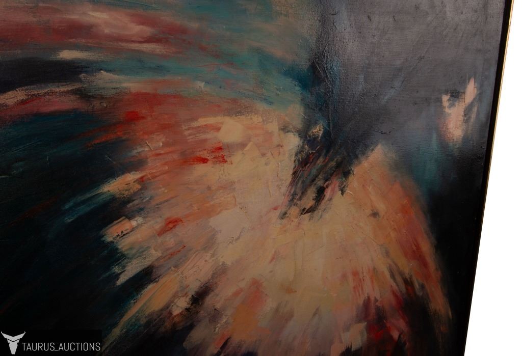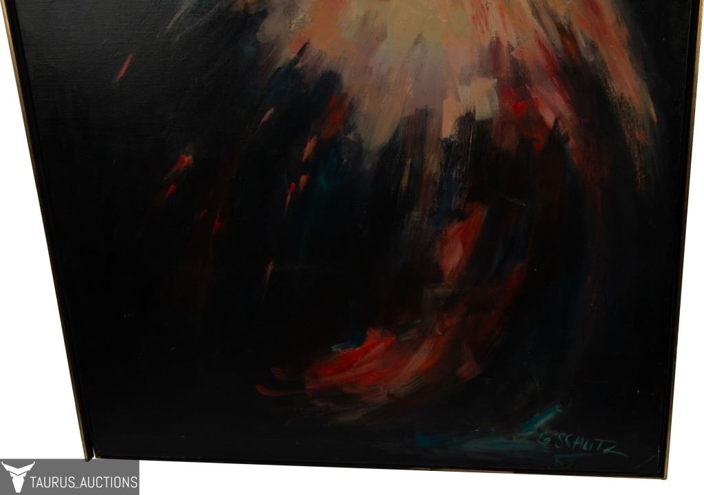 Item/Description: Original Mid Century Modern oil painting signed lower left. Reads in part: Schutz. Evokes an elemental natural event like volcanic eruption.