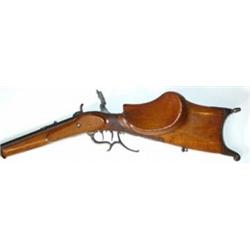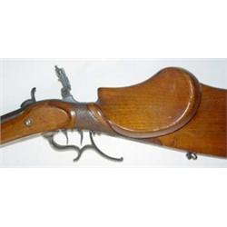 "Schutzen" Style Target Rifle. Believed To Have Been Manufactured In Pennsylvania In The Early 19th Century & May Be One Of The "Yeager" Rifles. No Serial #, Percussion Lock By Pyne, Double Set Triggers, Tang Sights, Fancy Grade Stock. 36 Caliber Muzzle Loading Black Powder. Recovered >From The San Carlos Apache Indian Reservation in 1950.