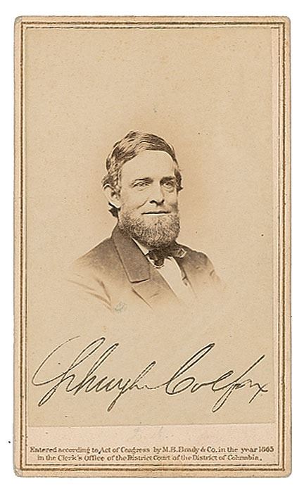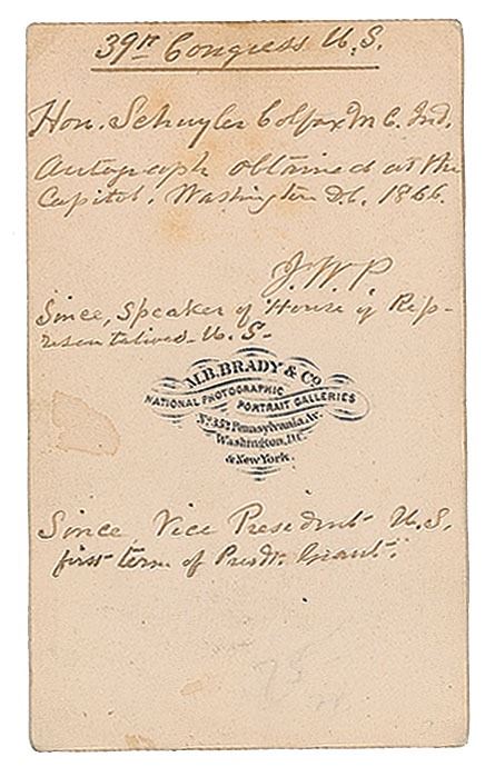 Choice 2.5 x 4 carte-de-visite photo of Colfax by Mathew Brady, neatly signed in ink, "Schuyler Colfax." Collector's annotations on the reverse read, in part: "Autograph obtained at the Capitol, Washington, D.C., 1866." In fine condition.