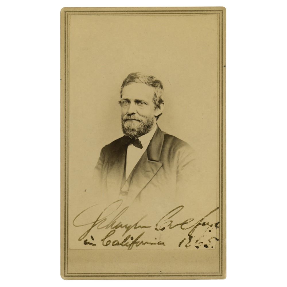 Outstanding Civil War–era 2.5 x 4 carte-de-visite photo of Colfax by Wm. Shaw of San Francisco, signed at the bottom of the image in ink, "Schuyler Colfax in California, 1865." Reverse bears an affixed two-cent revenue stamp. In fine condition.