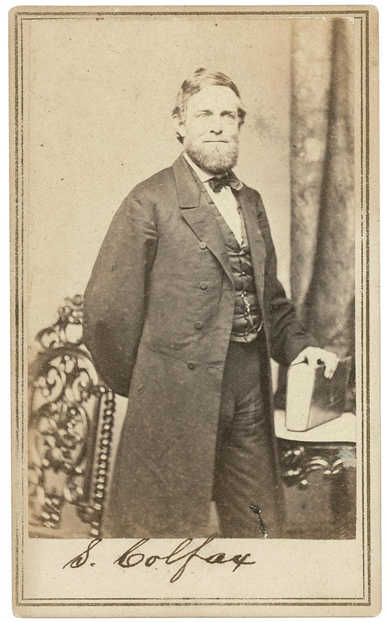 American statesman (1823–1885) who served as speaker of the house and as vice president under Grant. His political career was ultimately ruined by his involvement in the Credit Mobilier Affair and other scandals. Original vintage 2.5 x 4 carte-de-visite photo by E. & H. T. Anthony of New York, signed in the lower border in black ink, “S. Colfax.” Some scattered light surface marks and dings, and a bit of light silvering to darker areas of image, otherwise fine condition. RRAuction COA.