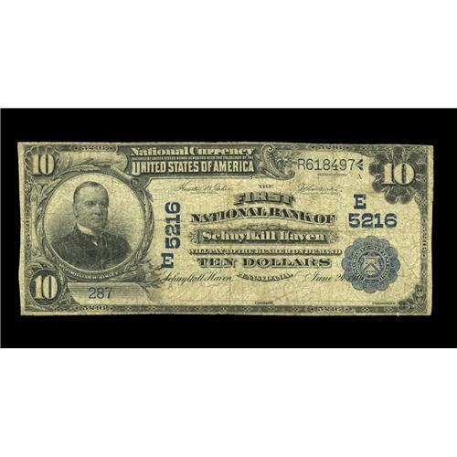 <B>Schuylkill Haven, PA</B></I> - $10 1902 Plain Back Fr. 632 <B>The First NB </B></I> Ch. # (E)5216<BR>This example which carries this popular bank title is quite circulated, but is complete. <B>Very Good.</B></I>