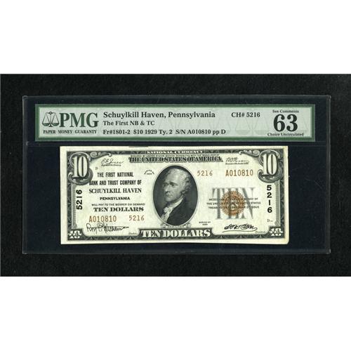 <B>Schuylkill Haven, PA</B></I> - $10 1929 Ty. 2 <B>The First NB & TC</B></I> Ch. # 5216<BR>This bank only issued $10s in small size. Officers are R.E. Williams and F.B. Keller. Graded <B>PMG Choice Uncirculated 63 EPQ.</B></I><BR><BR><b>Shipping:</b> Coins & Currency (<a target="_blank" href="http://www.heritageauctions.com/common/shipping.php">view shipping information</a>)