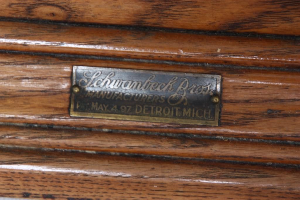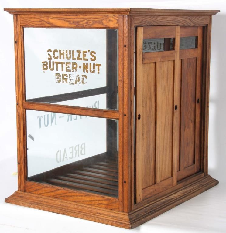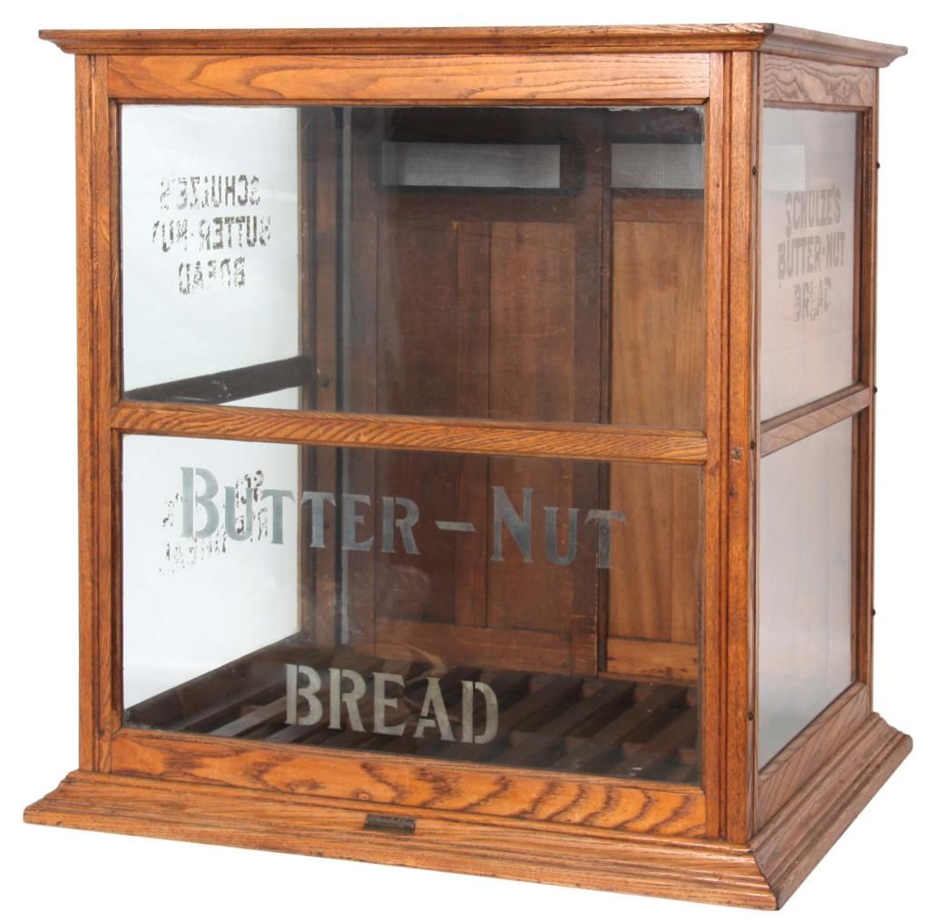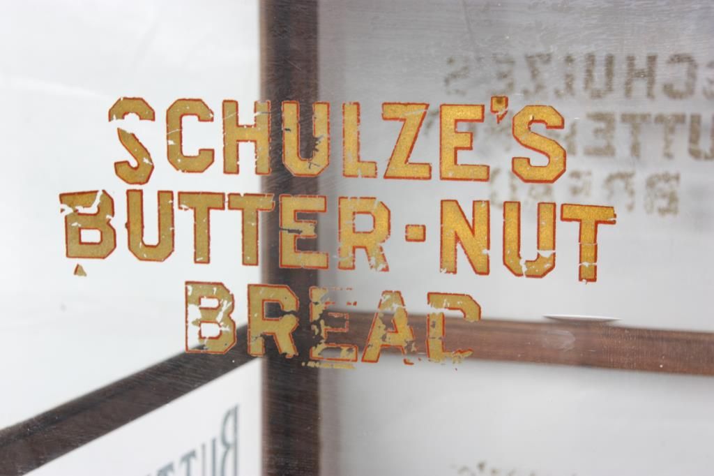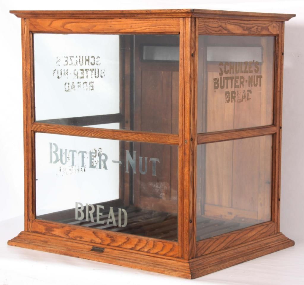 Schwanbeck Bros. Bread Display Case. Oak store display case with overhanging oak top and base with oak trim and 2 doors in the back; has 2 horizontal glass panels on the front and side with reverse decorated advertising for Schulze’s Butter-Nut Bread. Signed on a brass tag on the front Schwanbeck Bros. Manufacturers, Detroit, Mich. In good condition with a clean original finish. 31 in. high x 30 in. wide x 24 in. deep.