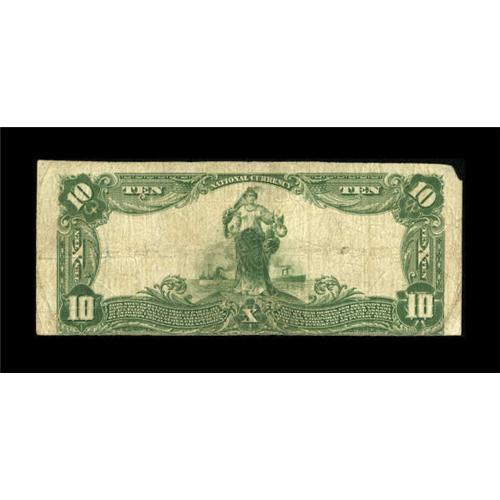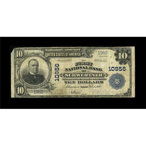 <B>Schwertner, TX</B></I> - $10 1902 Plain Back Fr. 632 <B>The First NB</B></I> Ch. # 10956<BR> This is a very elusive note in large with just $980 in large size outstanding in 1935 and only six large notes in the census. This example has a delicate pen signature of the cashier and a lightly purple stamped signature of Adolph Schwertner, the president. He founded the eponymous community in 1903 when he built a cotton gin there. The upper left corner tip is missing. <B>Fine</B></I>.<BR><I>From The Kansas City Collection.</B></I><BR><BR><b>Shipping:</b> Coins & Currency (<a target="_blank" href="http://www.heritageauctions.com/common/shipping.php">view shipping information</a>)