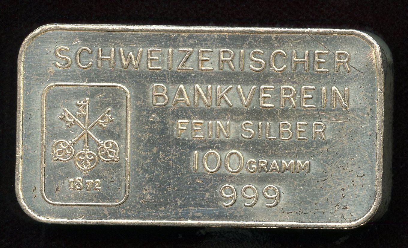 Schwizerischer Bankverein Fine Silver 100 Gram Bar - Engraved on back A Piece of Silver for a Piece of Gold. 2-18-1966.