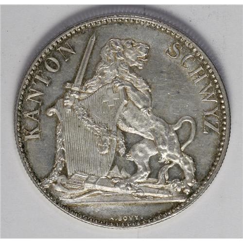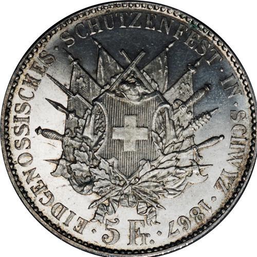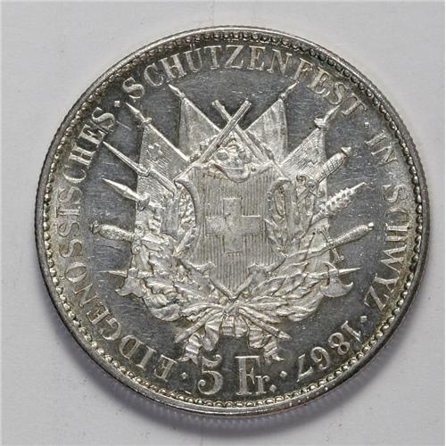 <B>Schwyz. 5 Francs 1867,</B></I> KM-S9, issued for the shooting festival, Choice AU-UNC, brilliant silvery surfaces, few marks, light gold toning. Unusually fine eye-appeal for the grade. Mintage: 8,000 coins.<BR><BR><b>Shipping:</b> Coin/Currency (<a target="_blank" href="http://www.heritageauctions.com/common/shipping.php">view shipping information</a>)