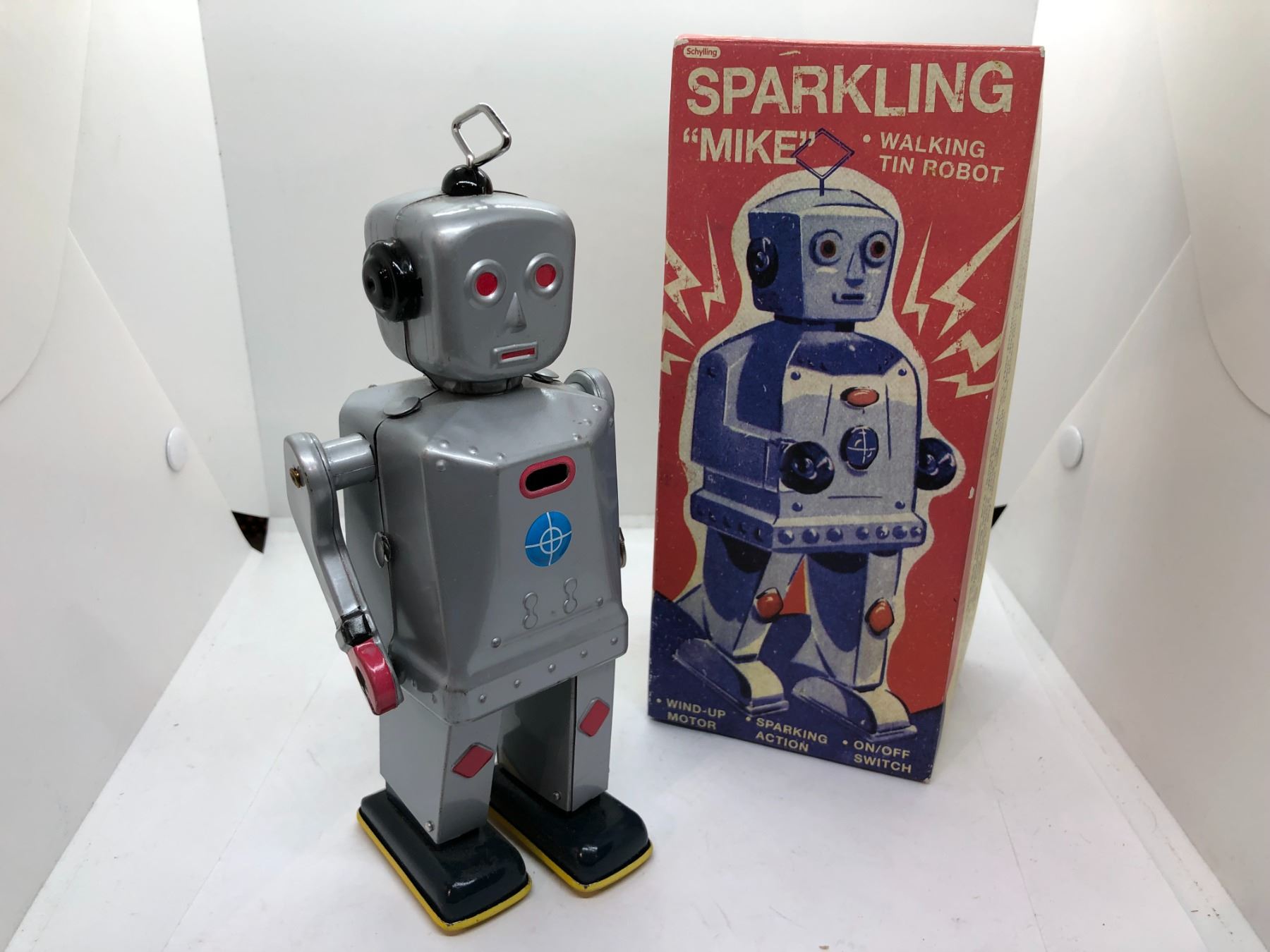 Schylling sparkling "mike" walking tin lithograph windup robot toy w/original box
