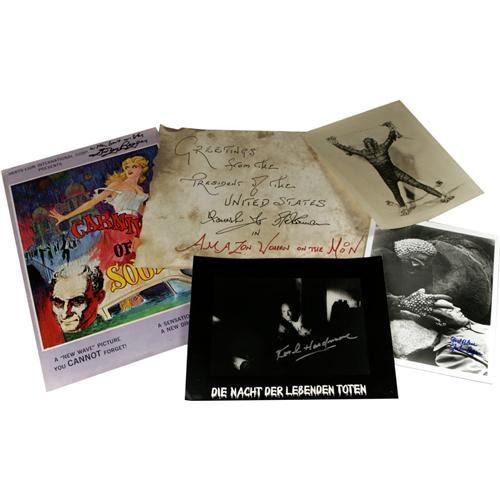 <B>Sci-Fi Autographs Assortment.</B></I> Includes a b&w 8" x 10" signed by John Agar in blue marker, a b&w 9" x 11" German promo still for <I>Night of the Living Dead</B></I> signed by Karl Hardman in Silver marker, an 11" x 17" poster for <I>Carnival of Souls</B></I> signed by Sandy Berger in black marker, and a 16.5" x 12" card signed by sci-f- archivist Forrest J. Ackerman (with wear and tear added for artistic effect), plus a great b&w 8" x 10" promo still of the Creature from the Black Lagoon. In overall Very Fine condition with some mild wear.<BR><BR><b>Shipping:</b> Flat Material, Small (<a target="_blank" href="http://www.heritageauctions.com/common/shipping.php">view shipping information</a>) <BR><BR><B>Important notice:<