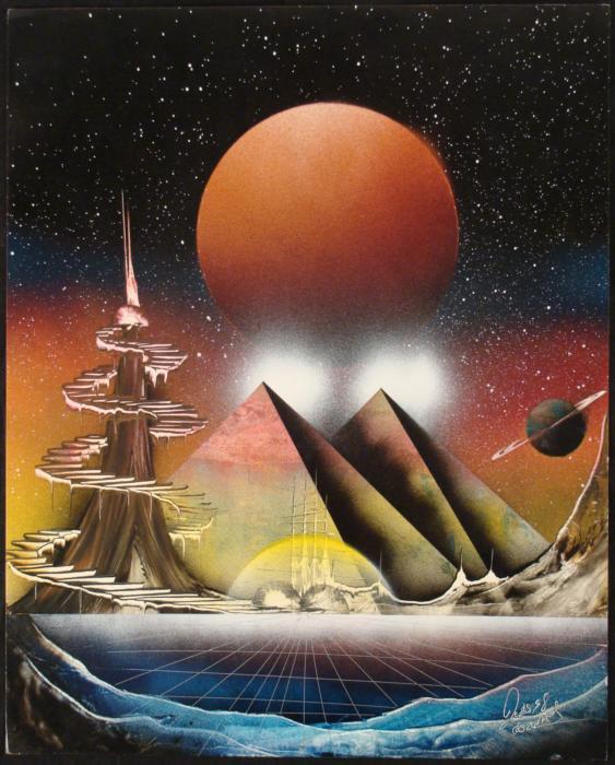 This original painting portrays a setting of an other-worldly civilization, evidenced by the impressive twin pyramids, and the spiral staircase tower. Artist: Signed, lower right Medium: Air brush and acrylic paint on paper; the grid on the bottom is etched in the paintSheet size: 15 3/4 x 19 3/4 inches Condition: Excellent; some corner wearThis terrific original artwork is full of intrigue for fans of science fiction and fantasy.