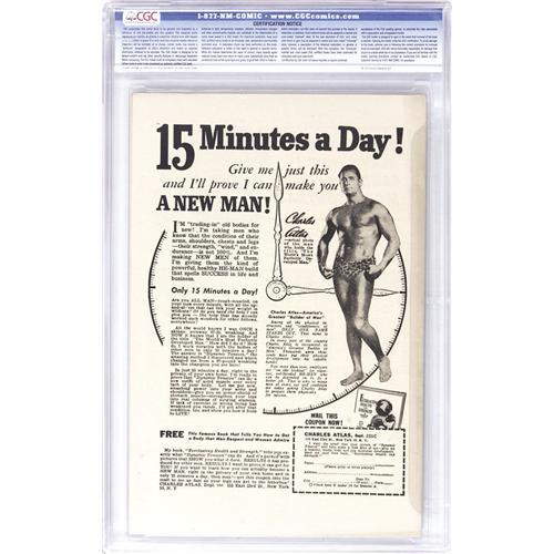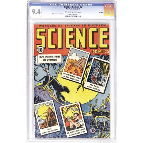 <B>Science Comics #2 Big Apple pedigree (Humor Publications/Ace, 1946) CGC NM 9.4 Off-white to white pages.</B></I> This is the only copy of this issue that CGC has certified to date. Rudy Palais contributed cover and interior art to this issue from Humor Publications, generally thought to be an imprint of Ace. Overstreet 2006 NM- 9.2 value = $105. CGC census 5/06: 1 in 9.4, none higher. <BR><BR><B>Important notice:</B> Heritage usually auctions material at the rate of 200-250 lots per hour. On some occasions eBay Live bid software or the Internet may not be able to keep up with the pace of the auction. We recommend placing a realistic absentee bid now as insurance to avoid disappointment. Occasionally the auctioneer may eliminate or reject an eBay Live bid, and the auctioneer may also reopen a lot after the close of the eBay live bidding (usually because we missed an audience bid), and may reject your bid even if it shows you as the winning bidder. By bidding via eBay Live, you agree that Heritage may award the lot to another bidder at its sole discretion under the circumstances described above or any other reasonable circumstances. Since eBay bids are not shown to us until we open the lot on the floor, we treat those bids just like floor bids. In most cases the floor responds before the eBay bid is presented to us, due to Internet lag time, so for consistency we have made it a policy that floor bids are always considered first over tie eBay live bids. Also please note that all Heritage lots purchased through eBay Live carry a 22.5% Buyer's Premium. Please make sure you read the Terms and Conditions before you bid. This lot is being auctioned in conjunction with a live floor auction by Heritage Auction Galleries. All final auction and invoice information will be supplied by Heritage Auction Galleries, and all other information should be considered preliminary. Lot:41001 <BR><BR><B>Winning Notification and Billing:</B> After the FINAL session in this auction is complete, Heritage will send e-mail and snail mail invoices. This process normally takes several days. All final auction and invoice information will be supplied by Heritage Auction Galleries, and all other information should be considered preliminary. <BR><BR>This auction will be conducted on a live auction floor and over the Internet through eBay Live. If you choose to place an absentee bid, please take a moment to <font color='#0000ff'><u><a href='http://pages.ebay.com/liveauctions/help/before/laabsentee.html'>learn how eBay Live absentee bidding works</a></u></font><font color='#000000'>