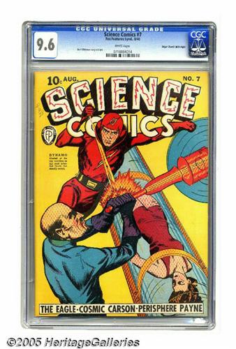 <B>Science Comics #7 Mile High pedigree (Fox, 1940) CGC NM+ 9.6 White pages.</B></I> The years have barely dimmed the luster of this copy from the collection of Edgar Church. That would describe most comic books from the most famed of pedigrees, but it's all the more impressive on a Fox issue. CGC hasn't certified another copy of #7 with a grade higher than VF- 7.5 to date. Bert Whitman contributed interior artwork. Overstreet 2005 NM- 9.2 value = $1,200. CGC census 6/05: 1 in 9.6, none higher.