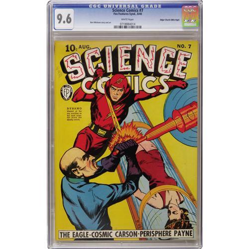 This is one of those copies you can identify as a Mile High without even seeing the penciled code or reading the notation on the slab! To find out why so much fuss is made about these Edgar Church books, simply look closely at our scan, then check out any other copy of <B>Science</B></I> #7 you might be lucky enough to find. And even that wouldn't be too easy -- as of this writing CGC has only certified three copies in any grade. Note the page quality as well! Dynamo is the hero on the cover, drawn by Bert Whitman. Overstreet 2006 NM- 9.2 value = $1,250. CGC census 12/06: 1 in 9.6, none higher.<BR><BR><b>Shipping:</b> Slabbed Comic (<a target="_blank" href="http://www.heritageauctions.com/common/shipping.php">view shipping information</a>)