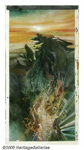 <B>Science Fiction Landscape Animation Background Painting Original Art (undated).</B></I> A panoramic scene of a city built deep within a crevasse on a bleak alien world is the focus of this large background from an unidentified science fiction film. The scene was painted on a 21" x 40" piece of paper, and there are registration holes punched along the edges of the paper. Aside from edge wear and a few small tears, outside of the image area, the art is in Very Good condition.
