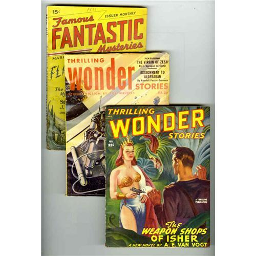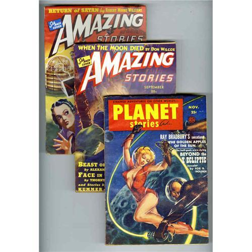 <B>Science Fiction Pulp Group (Various, 1939-53).</B></I> This group of pulps includes <B>Planet Stories</B></I> Nov. 1953 (Qualified FN, trimmed cover overhang, Ray Bradbury story, Kelly Freas cover art); <B>Amazing Stories</B></I> Sept. 1939 (Qualified FN, trimmed cover overhang); Oct. 1939 (Qualified FN, trimmed cover overhang); Nov. 1942 (VG, tape); <B>Thrilling Wonder Stories</B></I> Feb. 1949 (Qualified FN, trimmed cover overhang); Feb. 1953 (FN); <B>Famous Fantastic Mysteries</B></I> March 1940 (VG+), and <B>Hollywood Detective</B></I> June 1949 (GD, with 16 pages of comics featuring Dan Turner and Queenie Starr). All of these pulps have supple pages. Bookery's Guide to the Pulps VG value for group = $160.