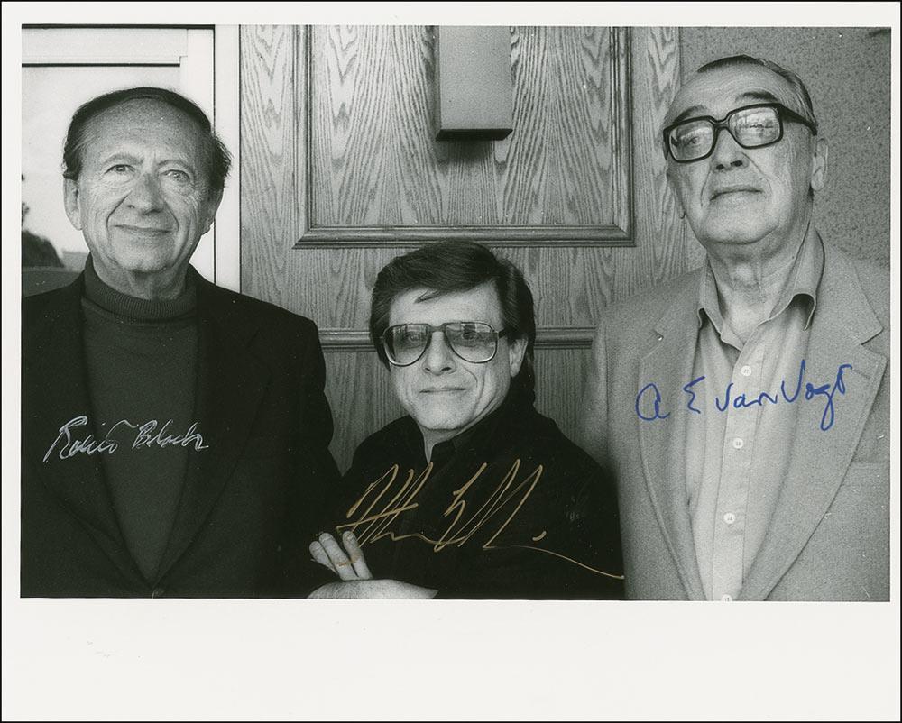 Cardstock 10 x 8 photo of Robert Bloch, Harlan Ellison, and A. E. Van Vogt, signed in silver ink by Bloch, in gold ink by Ellison, and in blue felt tip by Van Vogt. In fine condition.