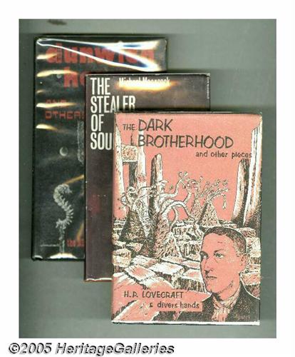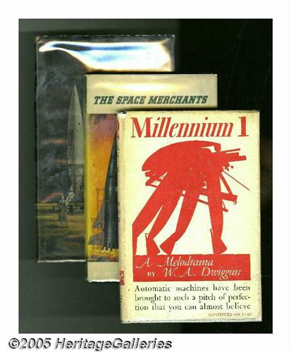 <B>Science Fiction and Horror Hardcovers Group.</B></I> Included here are <B>Millennium 1</B></I> by W. A. Dwiggins (first edition; one of 1,750 copies printed; Knopf 1945); <B>The Stealer of Souls</B></I> by Michael Moorcock (featuring Elric; British edition; Neville Spearman 1963; a corner of the front flap has been clipped, and a previous owner's bookplate is glued in); <B>Take Off</B></I> by Cyril M. Kornbluth (first edition; Doubleday 1952); <B>The Space Merchants</B></I> by Frederik Pohl and C. M. Kornbluth (Ballantine 1952; Pohl's name is written on the first page, presumably an autograph by the author); <B>The Dunwich Horror and Others</B></I> by H. P. Lovecraft (Arkham House 1963; pen marks on the table of contents page); and <B>The Dark Brotherhood and Other Pieces</B></I> by H. P. Lovecraft and Divers (sic) Hands (first edition, $5 cover price). All are hardcovers with their original dust jackets. The books average Very Good condition.
