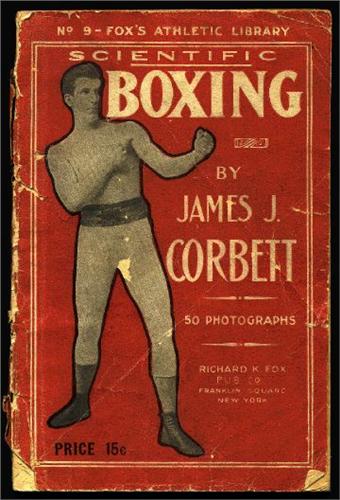Scientific Boxing. By James J. Corbett, American professional fighter, nicknamed "Gentleman Jim." Achieved title of world's championship boxer in 1892, by knocking down John Sullivan in the 21st round. This book shows Corbett on cover, with 50 photos, and "hints on training and the official rules." Pub. by Fox, N.Y.C., 1912, 110pp., paper covers. Wear at spine, edge tear, contents clean. Rare.