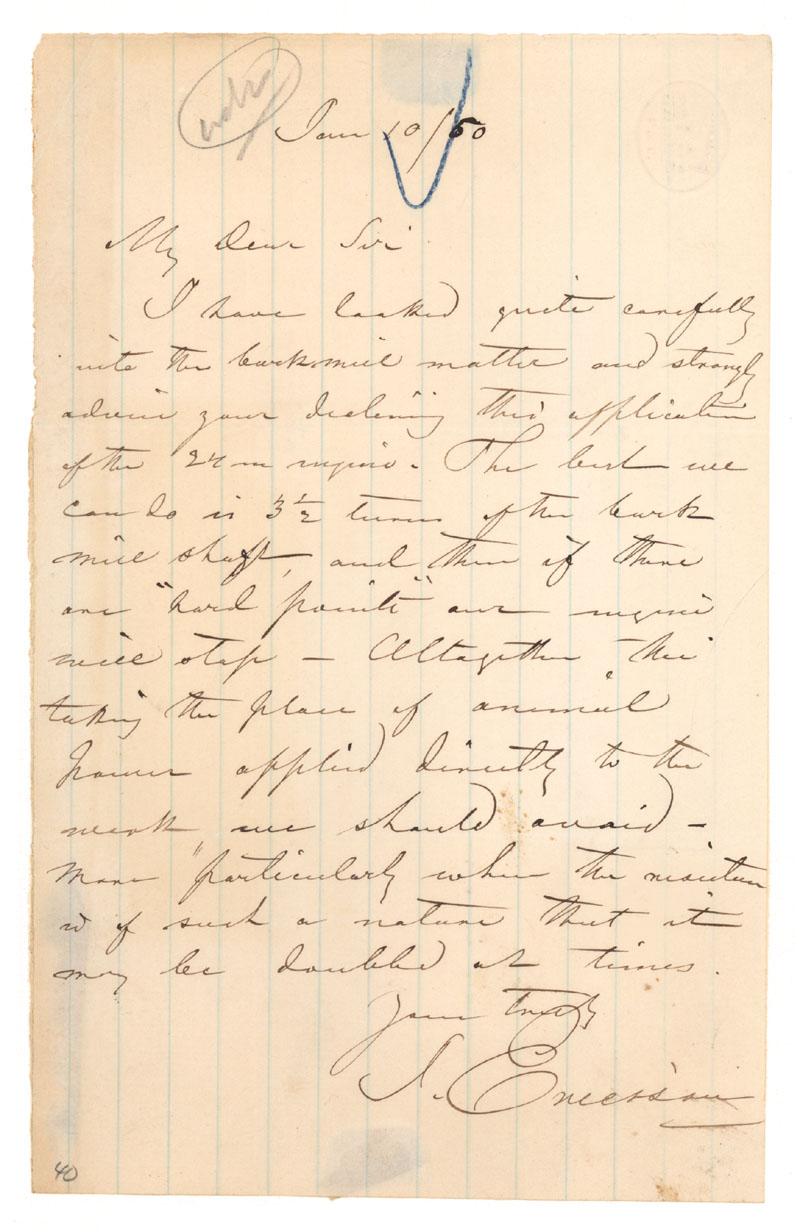 JOHN ERICSSON (1803-1889) Swedish inventory and engineer. After working on locomotive steam engines early in his career, John Ericsson turned his engineering talents to steam engines in maritime applications. Ericsson is best known for his invention of the twin screw propulsion design and for his design of the USS Monitor. Autograph Letter Signed. One page, 4 3/4” x 7 1/2”. No place. January 10, 1860. Ericsson writes, in part: “ …. I have looked quite carefully into the buckmill matter and strongly advise your backing the application of the 24 in. engine. The best we can do is 3 1/2 turns of the buckmill shaft and then if there are ‘hard points’ our engine will stop -- Altogether this taking the place of animal power applied directly to the work we should avoided … ” Mounting trace on verso. A few minor toning spots. Overall Very Fine.
