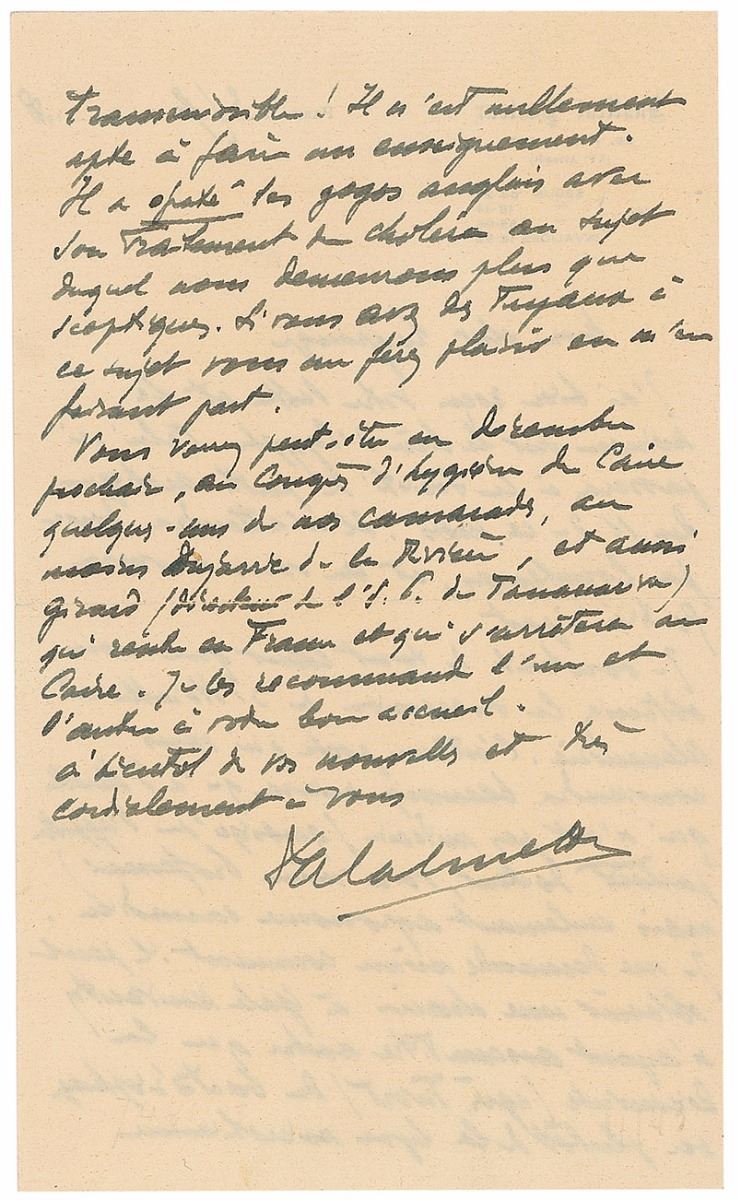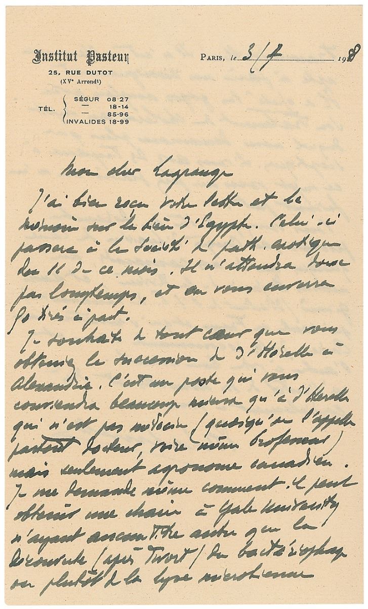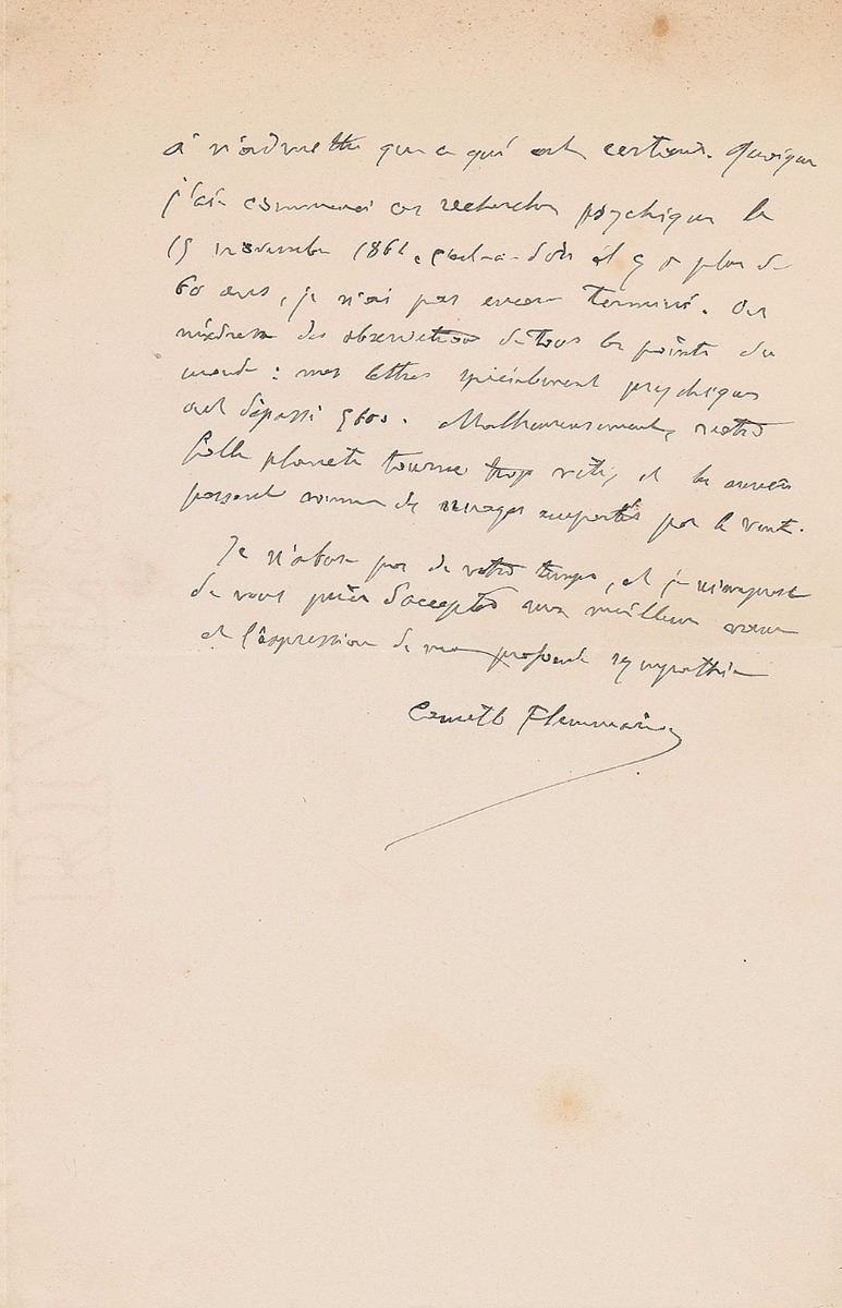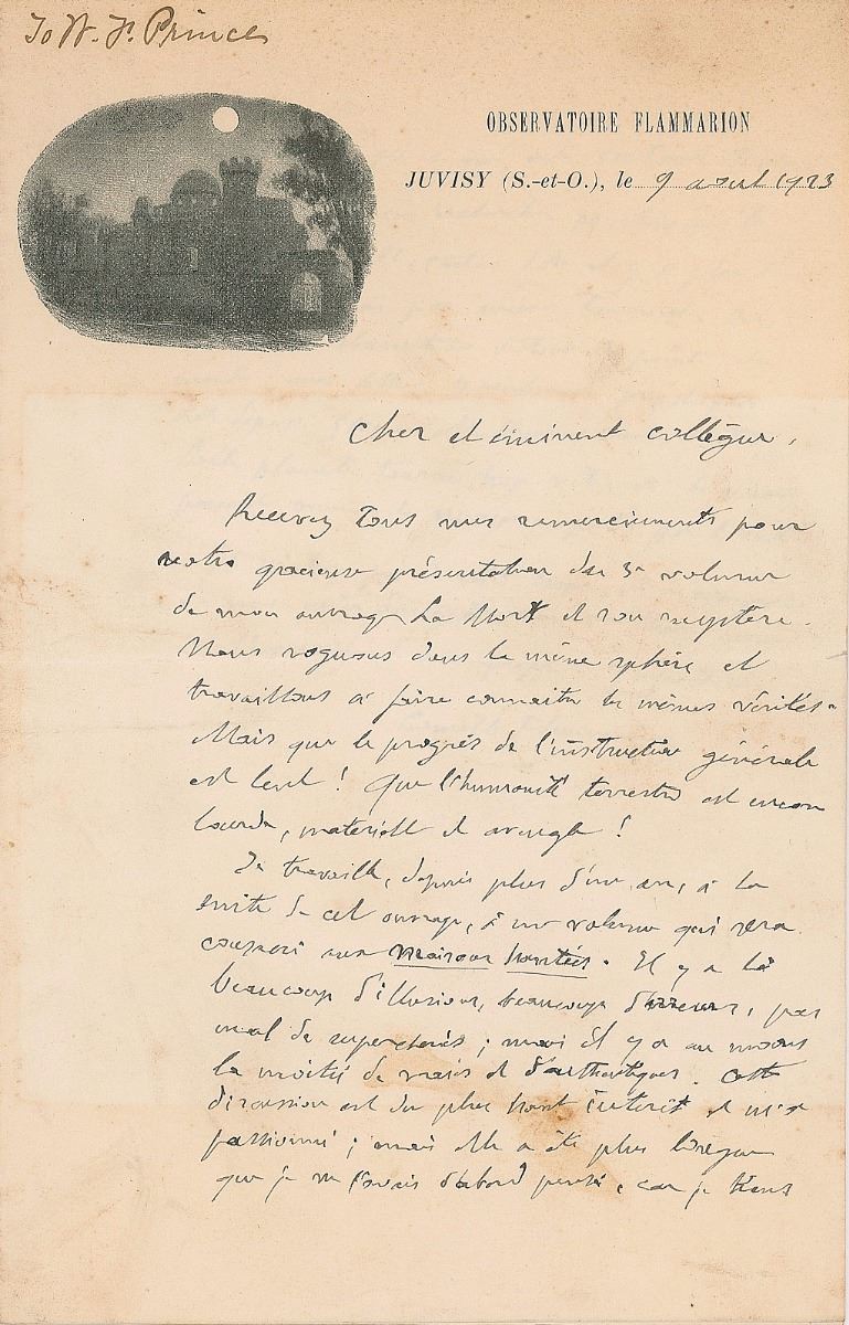 Three items signed by French scientists, including: an ALS in French by Albert Calmette, one page both sides, Institut Pasteur letterhead, July 3, 1908, in part (translated): “With all my heart I hope that you will be Hoselle's successor in Alexandria. It's a position far more suitable for you than for Hoselle who is not a doctor (even though everyone calls him Dr., even professor). He's just a Canadian agronomist. I wonder how he can get a chair at Yale University since he has no title other than that of bacteriophage or rather of transmissible microbial decomposition. He fooled those English suckers with his cholera treatment about which we remain more than skeptical. Perhaps you're coming to the Hygiene Congress in Cairo in December. Some of our comrades will attend”; an ALS in French by Camille Flammarion, two pages on two adjoining sheets, Observatoire Flammarion letterhead, August 9, 1923, to psychic researcher Walter Franklin Prince, in part (translated): “Accept all my thanks for your generous presentation of the 3rd volume of my Work La Mort et son mystere. We are both working in the same sphere and trying to make known the same truths. But how slow is the progress of general instruction. How heavy, material, and blind earthly humans still are! For more than a year I’ve been working on…Maisons hantees (Haunted Houses). There is much illusion, much error there, but at least half of the experiences are true and fantastic…I began this psychic research in 1861…it’s not finished yet. I receive reports…from all over the World…Unfortunately our crazy planet turns too fast”; and an eye-catching 4.25 x 5.75 color postcard photo of a man flying a bi-plane, signed on the reverse in black ink by Auguste Piccard, “A. Piccard,” beneath a typed message in German (translated): “Flying is a patriotic duty!” In overall fine condition.