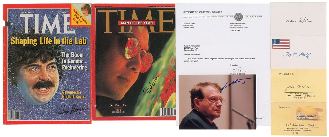 Group of eight items signed by noteworthy scientists, highlighted by several Nobel Prize winners, including: Albert Sabin (signature), Luc Montagnier (SP), William Shockley (signature), John Bardeen (signature), David Ho (magazine cover), Charles H. Townes (TLS), Herbert Boyer (magazine cover), and Robert Gallo (signature). In overall very good to fine condition, with creasing and tears to the magazine covers.