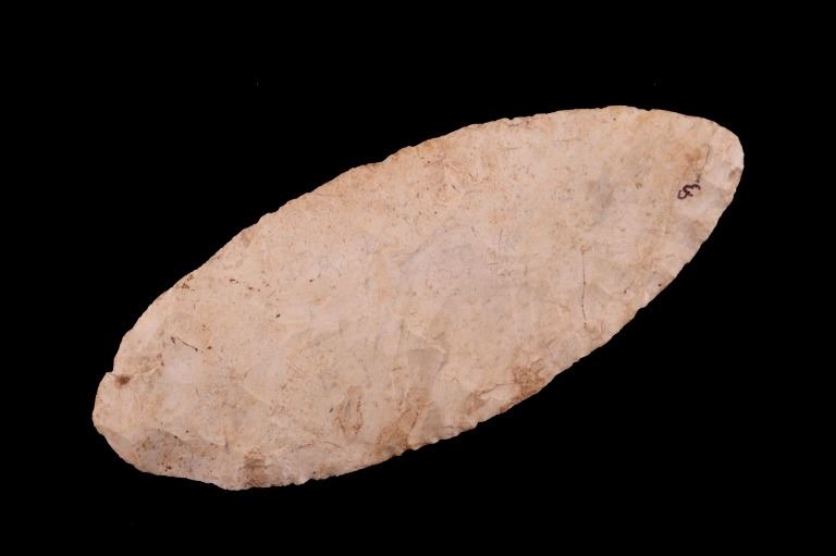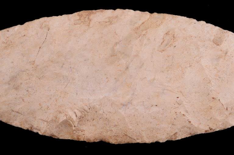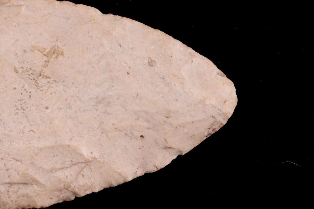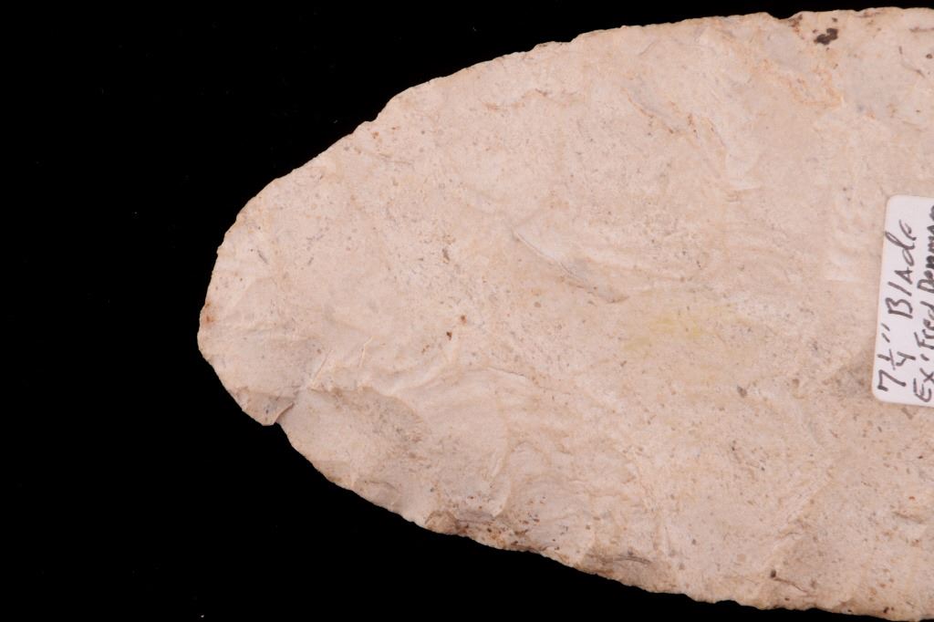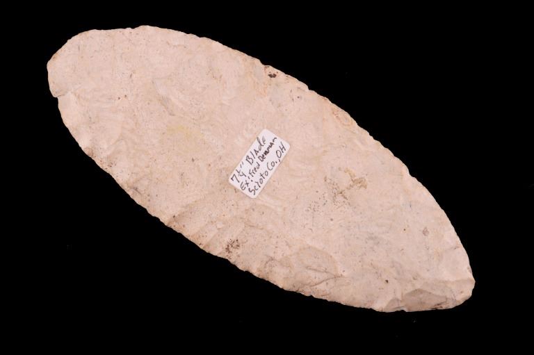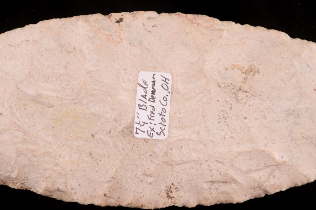 Featured in this lot is this Scioto Co. Ohio Adena point blade, circa 3500 - 1300 B.P. and aged from the Late Archaic to Woodland period. The point shows a large, thin ovoid shaped blade with a flattened cross section, an excurvate shape that's broad, and a convex base. The point shows random flaking patterns from a white chert material. The condition of this point is good, with no obvious signs of damage. The measurements of this Adena point are 7 1/4" x 3" x 1/2".