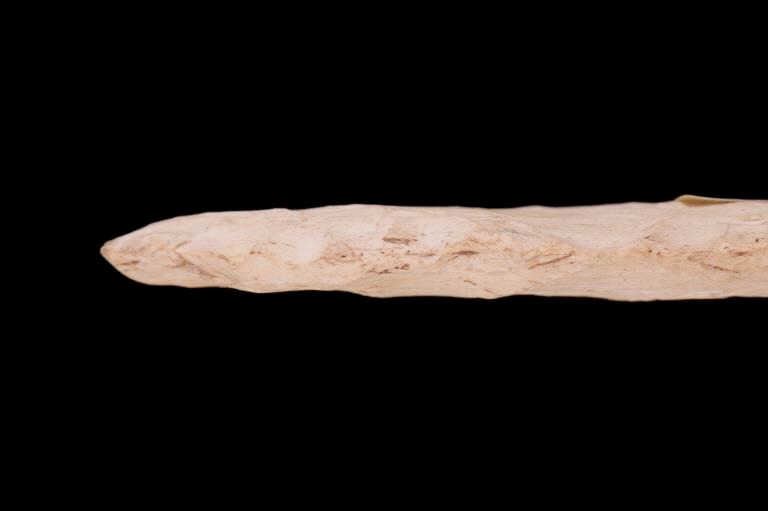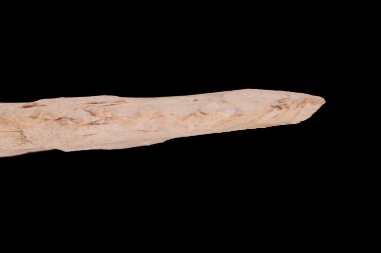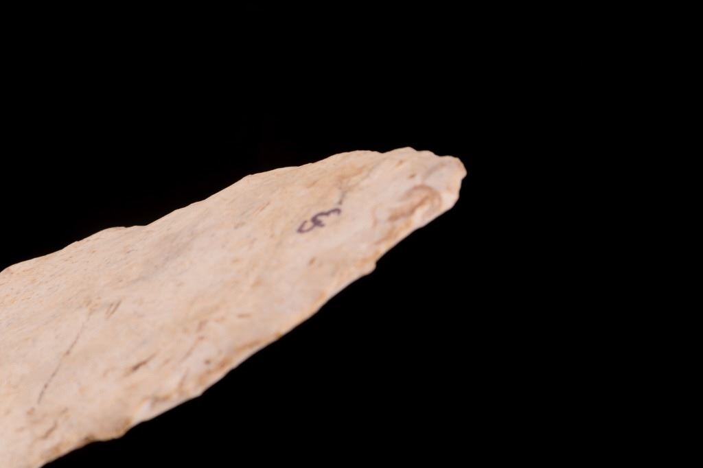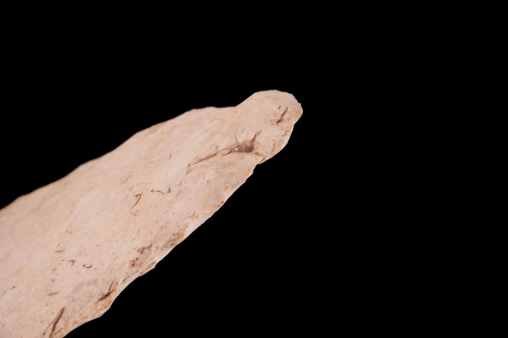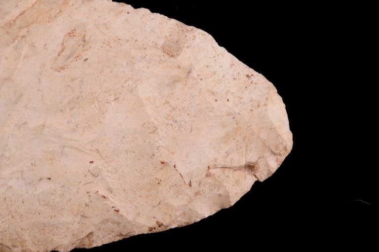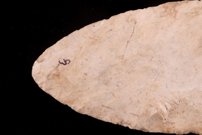 Featured in this lot is this Scioto Co. Ohio Adena point blade, circa 3500 - 1300 B.P. and aged from the Late Archaic to Woodland period. The point shows a large, thin ovoid shaped blade with a flattened cross section, an excurvate shape that's broad, and a convex base. The point shows random flaking patterns from a white chert material. The condition of this point is good, with no obvious signs of damage. The measurements of this Adena point are 7 1/4" x 3" x 1/2".