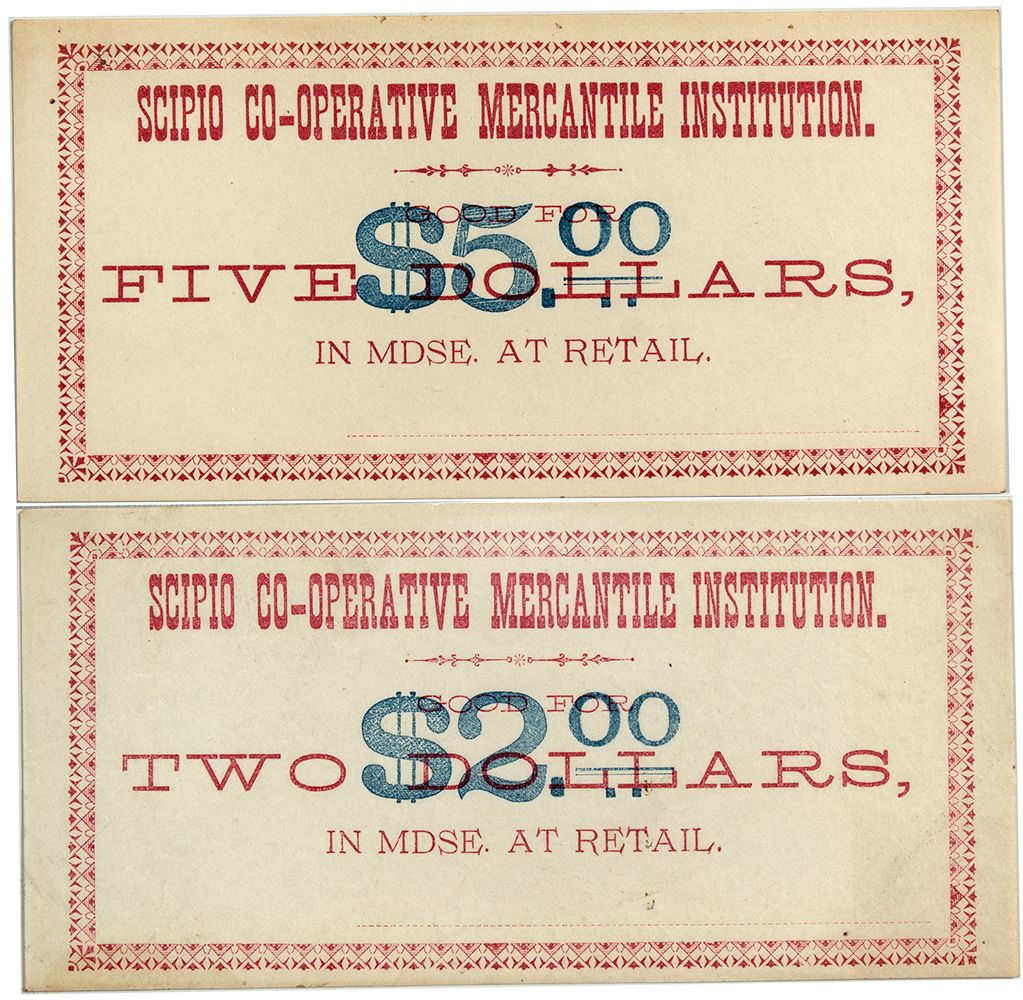 1869 This is a lot of two Scipio notes. PMG About Uncirculated 55 & PMG Choice Circulated 64. Two of the highest denominations produced by Scipio. Both are Unc and appear bright and attractive. These are getting harder and harder to locate. Rust 200 & Rust 201. - HKA#66170