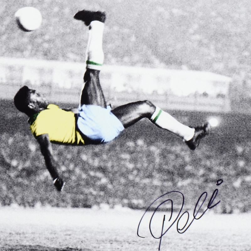 "Scissor Kick" is a print on paper that is autographed by legendary Brazilian footballer, Pele! This piece is presented with a Certificate of Authenticity from PSA/DNA, which authenticates sports memorabilia using proprietary permanent invisible ink as well as a strand of synthetic DNA. We make no additional warranties. Measures approx. 20" x 16" (image).