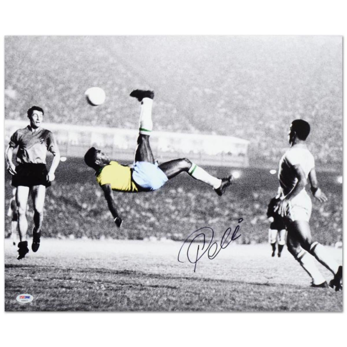 "Scissor Kick" is a print on paper that is autographed by legendary Brazilian footballer, Pele! This piece is presented with a Certificate of Authenticity from PSA/DNA, which authenticates sports memorabilia using proprietary permanent invisible ink as well as a strand of synthetic DNA. We make no additional warranties. Measures approx. 20" x 16" (image). Reference #: 218813.